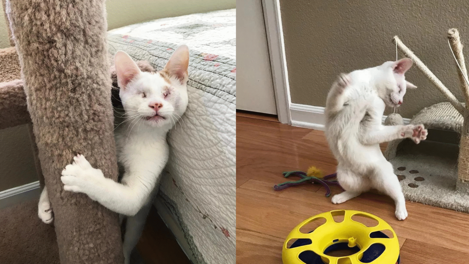 Meet Wally, a blind kitten who went from clinging to life in a parking lot tree to becoming a little ball of joy who tells his rescuers every single day just how grateful he is.