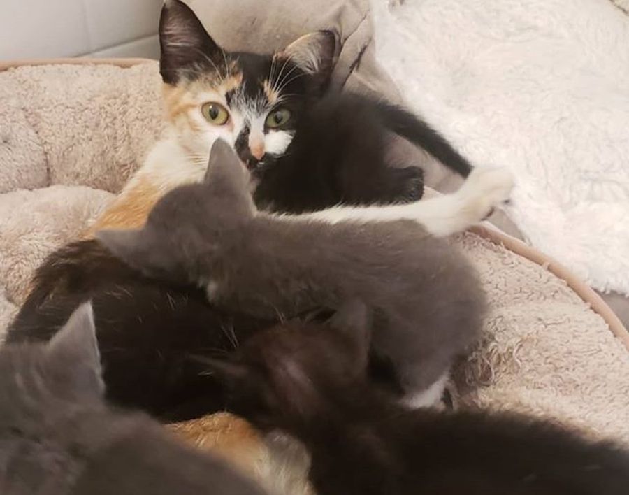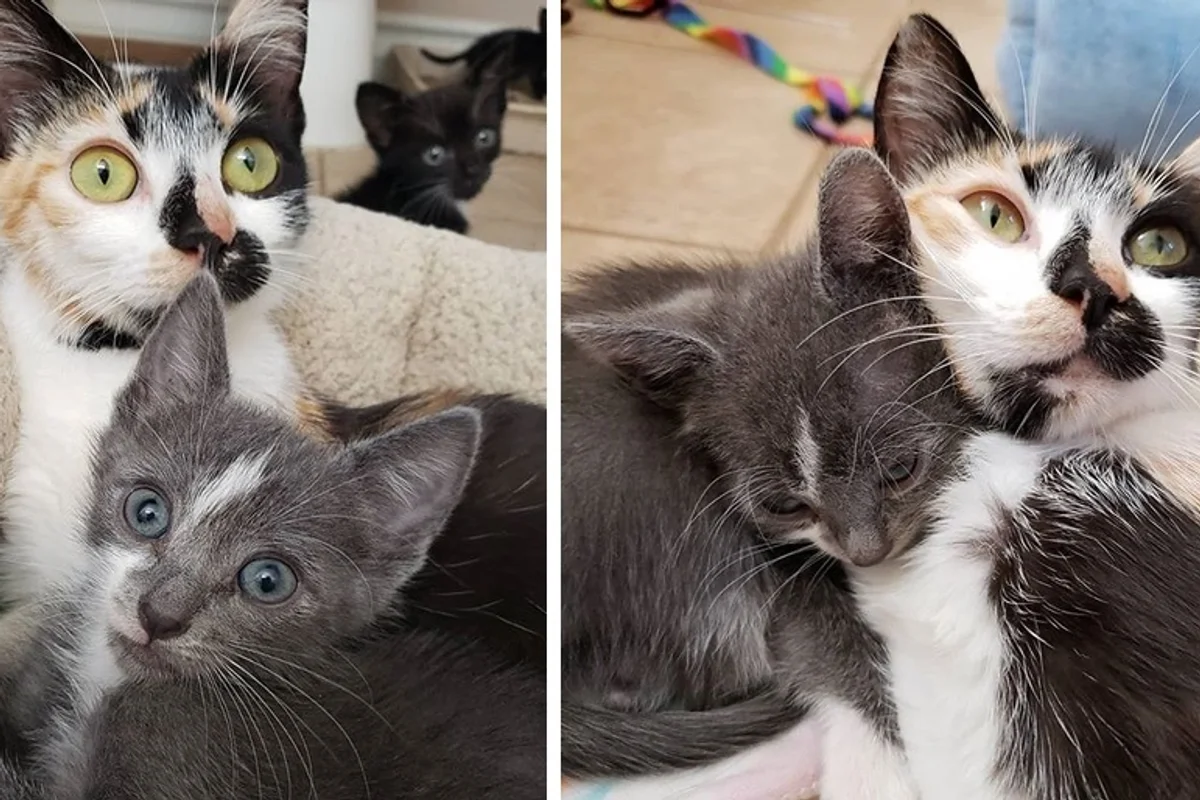 The doting cat mom started caring for her kittens right after they settled into their new abode. She was so happy to have a roof over their heads, and her purrs reverberated throughout the room.