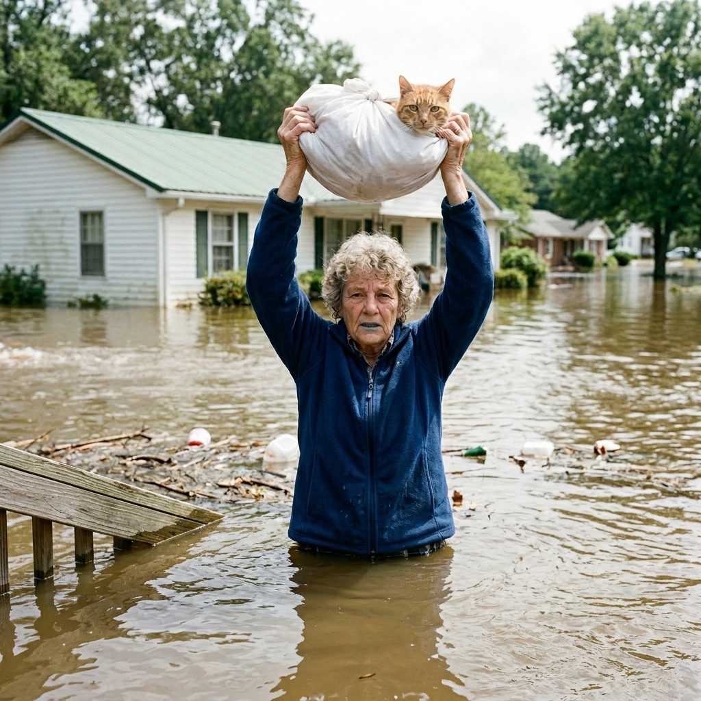 She was standing on the railing, water at her chest, both arms extended fully above her head. In her hands, held as high as her seventy-four-year-old body could reach, was a soaking wet pillowcase with a cat inside it. The pillowcase was above the waterline. She was not.