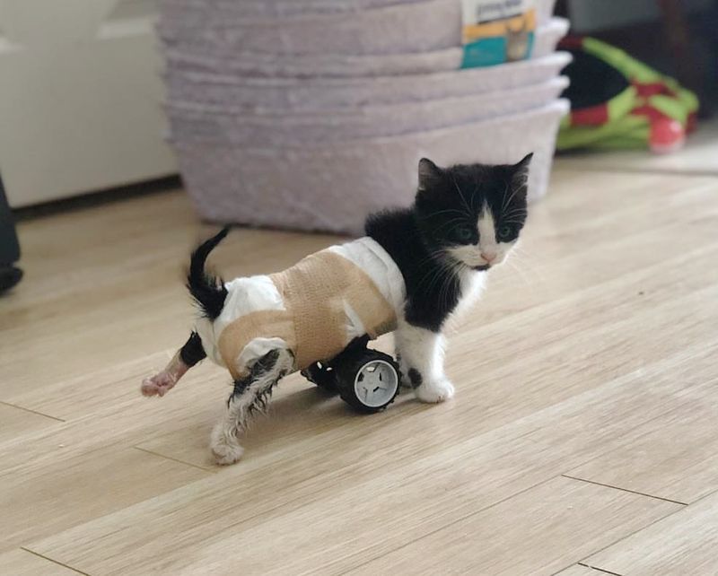 Jenifer was inspired by Bernard’s unstoppable energy and decided to give him the mobility he craved. Using parts from a toy car and a lot of creativity, she built a tiny cart—essentially a set of wheels tailored just for him. The moment she strapped it on, Bernard lit up. “He was off to the races with no hesitation,” said Alissa Smith of Wrenn Rescues. The brave tuxedo kitten zoomed around the room, thrilled with his newfound freedom. Watching him tear through the house with joy was proof that a physical limitation doesn’t define a life—especially not one as lively and resilient as Bernard’s.